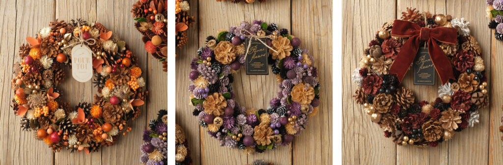 不動の人気を誇るオレンジ・パープルに加え、クリスマスや春にも大人気のリボンをあしらったリースが秋にも登場しました。