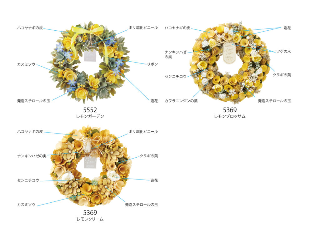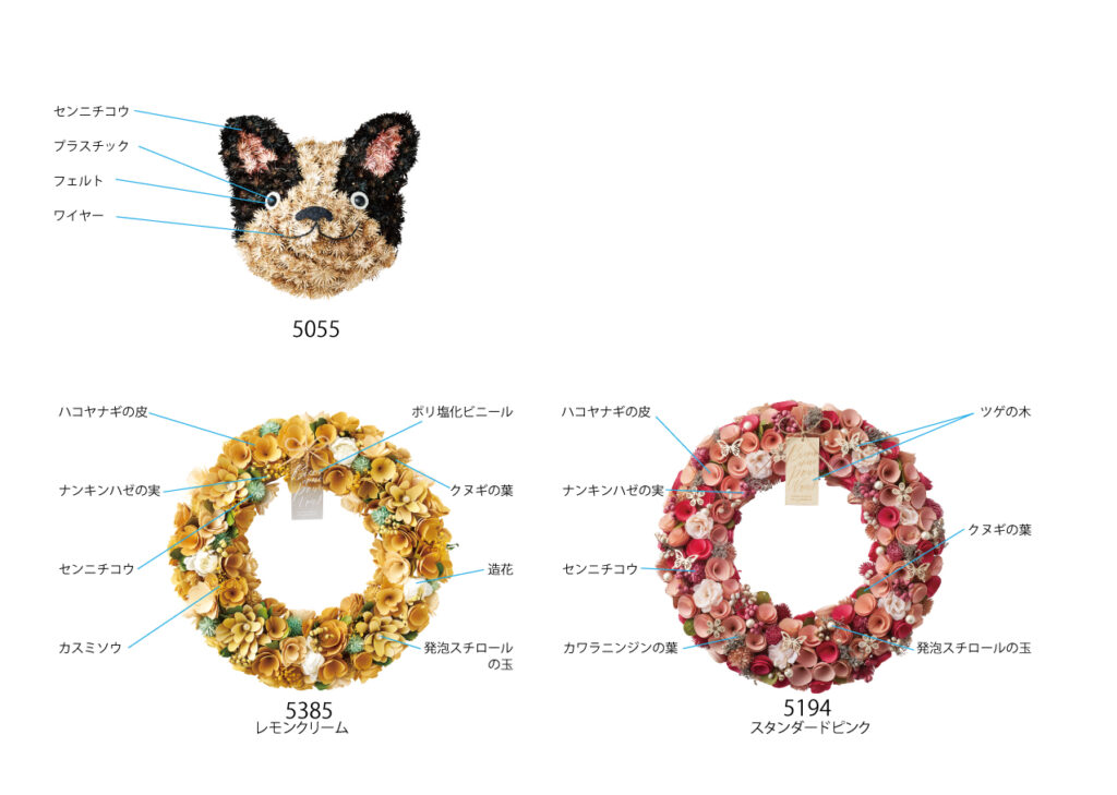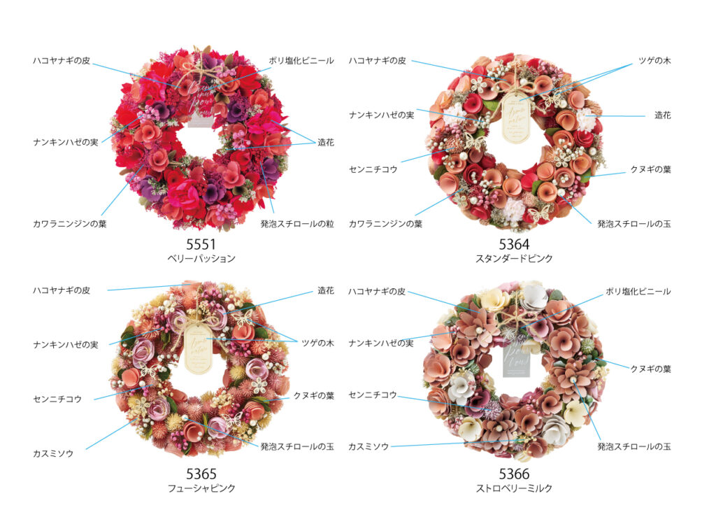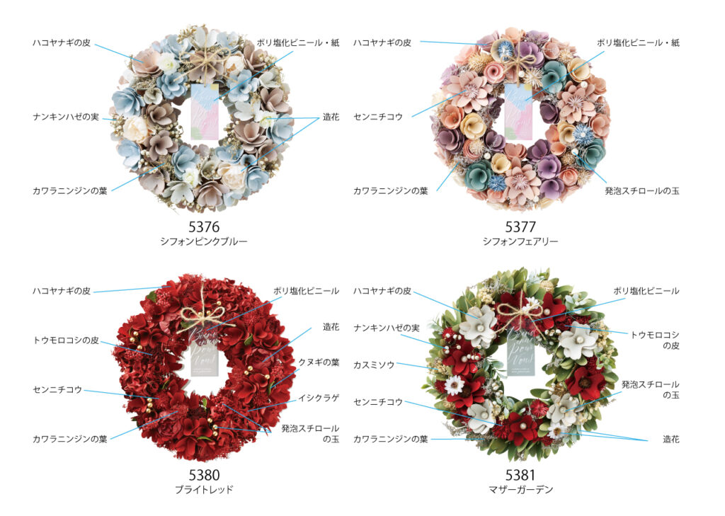 毎年人気の春リースの新作。今年の一押しは上品な色味が特徴のシリーズ。ひらひら揺れるオーガンジーリボンが好評です。その他にも定番のピンクや黄色など、バラエティに富んだラインナップを取り揃えております。 使用している材質のご紹介です。 お友達登録をして、様々な情報をGET!LINEでも情報配信中★ この記事を書いた人株式会社ケー・イー・アイ広報担当広報担当広報担当ブリキマンです!たくさんの商品情報と共に、旬な情報をお届けできたらと思います。株式会社ケー・イー・アイFollow :最近の記事一覧2025年12月23日GREENHOUSE2026春の新作ソープフラワー2025年12月23日GREENHOUSE猫トート付きソープフラワーブーケについて2025年12月19日GREENHOUSE笑顔の花咲くサプライズピック2025年12月18日GREENHOUSE遊び心満載のアレンジ用クリアカップ2025年12月17日GREENHOUSEタペストリーについて2025年12月16日GREENHOUSE故人を偲ぶ、心のこもったメモリアルグッズ広報担当の記事一覧