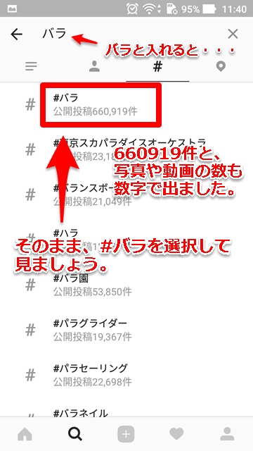 そこでタグを使って、検索を「バラ」とかけるとバラの投稿だけが抽出されて画面に出てきます。